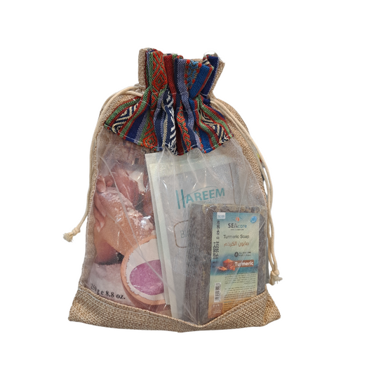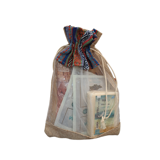 حقيبة فيها مجموعة من منتجات البحر الميت، أملاح ، صابونه ، طين